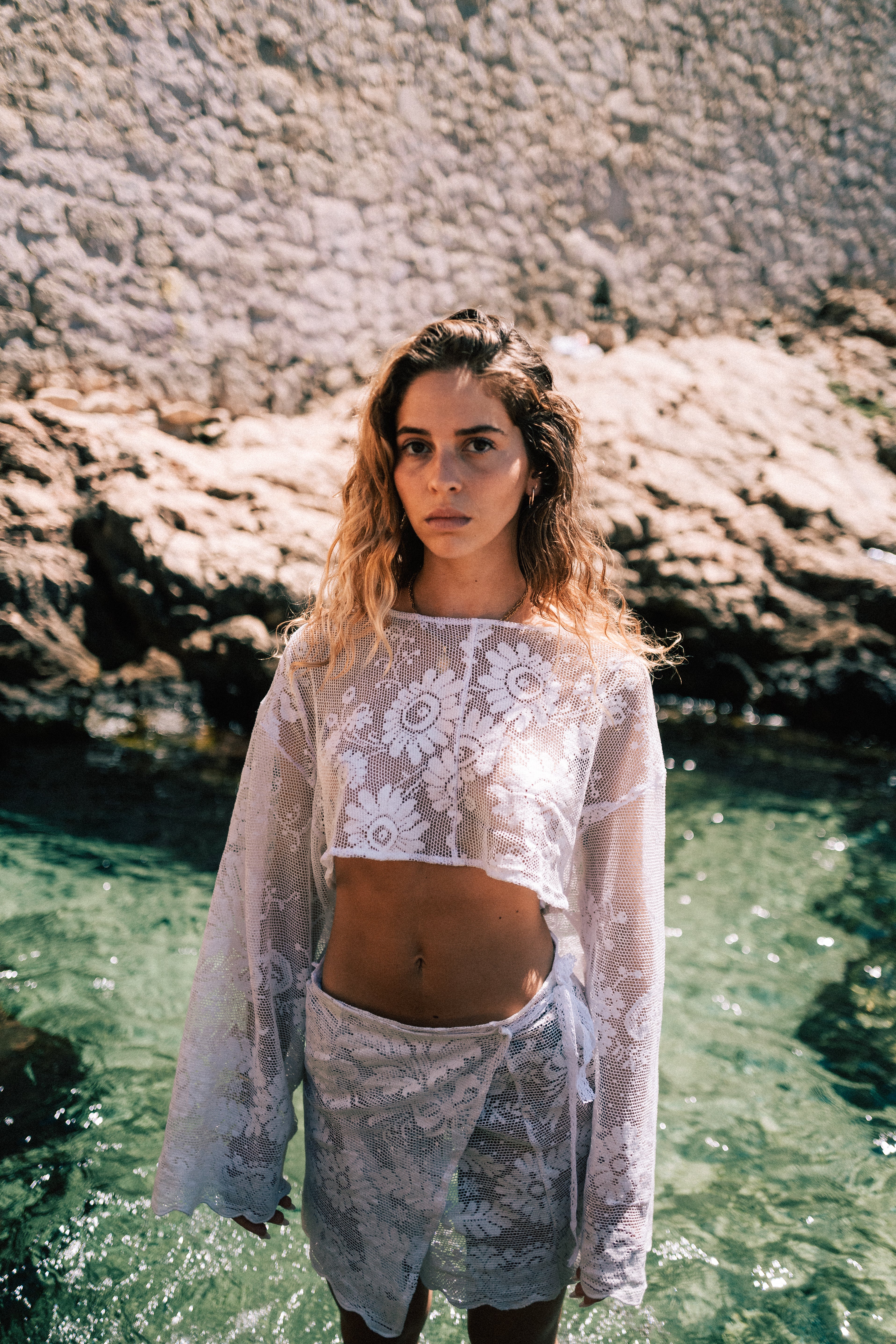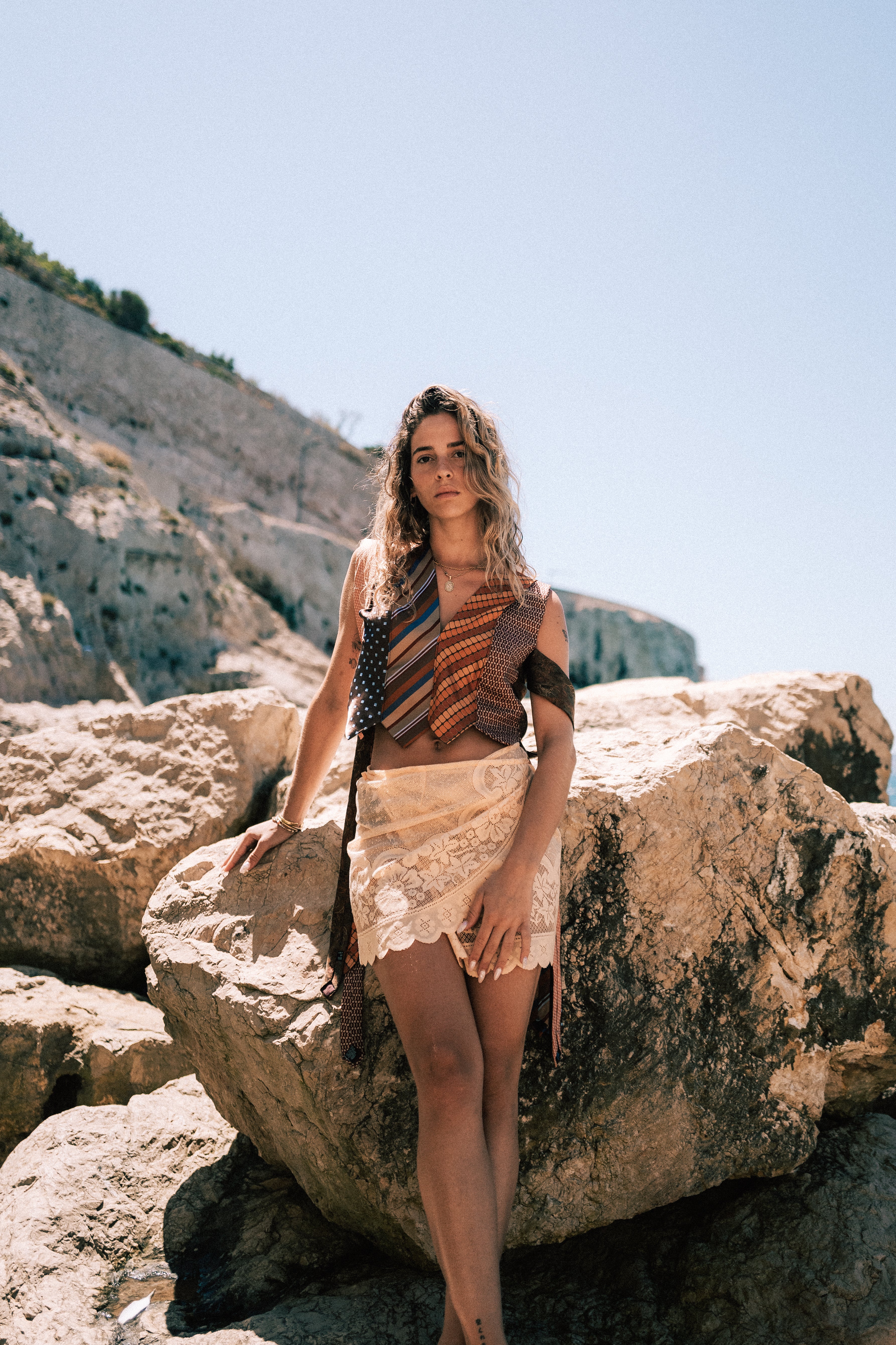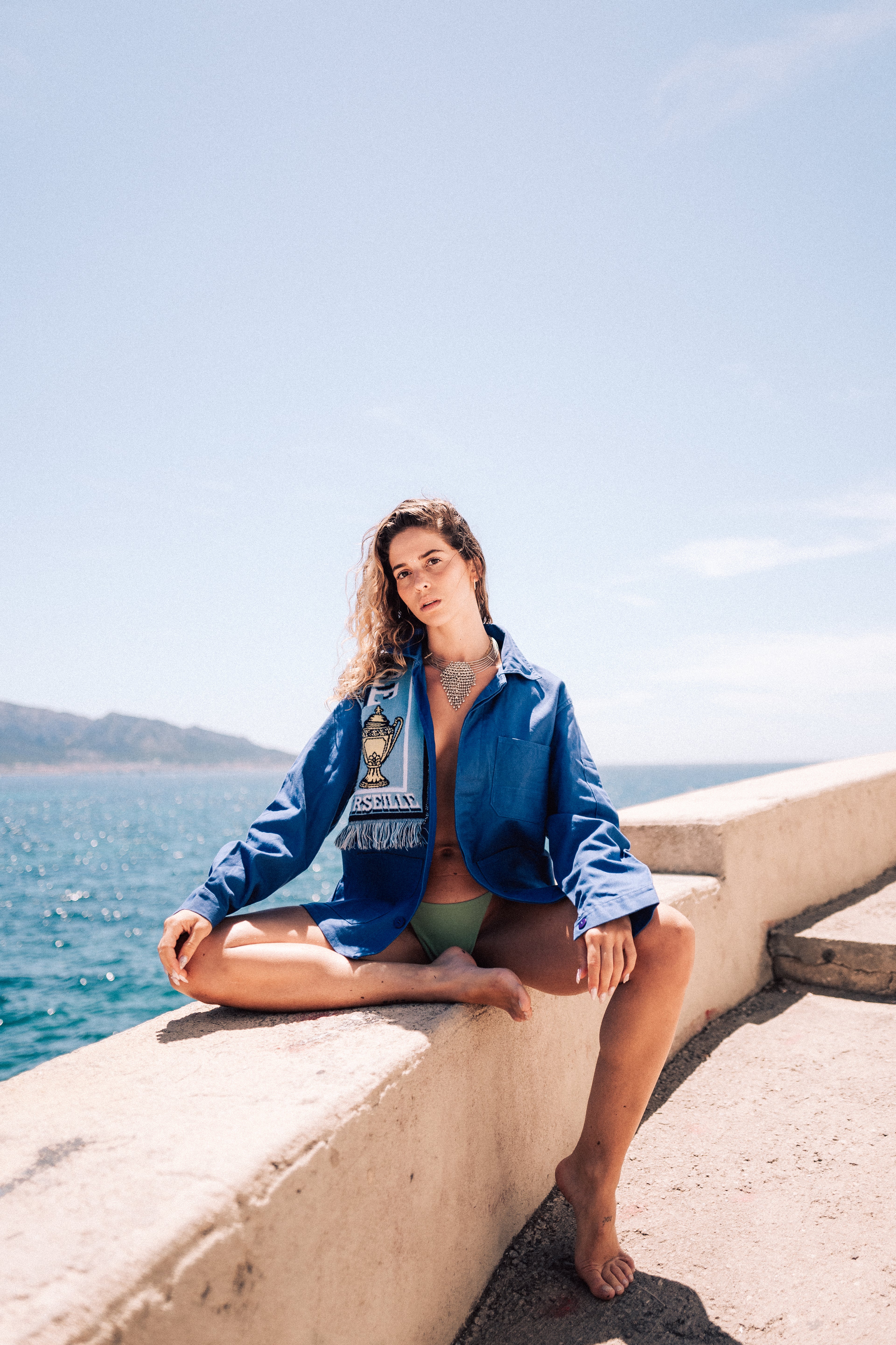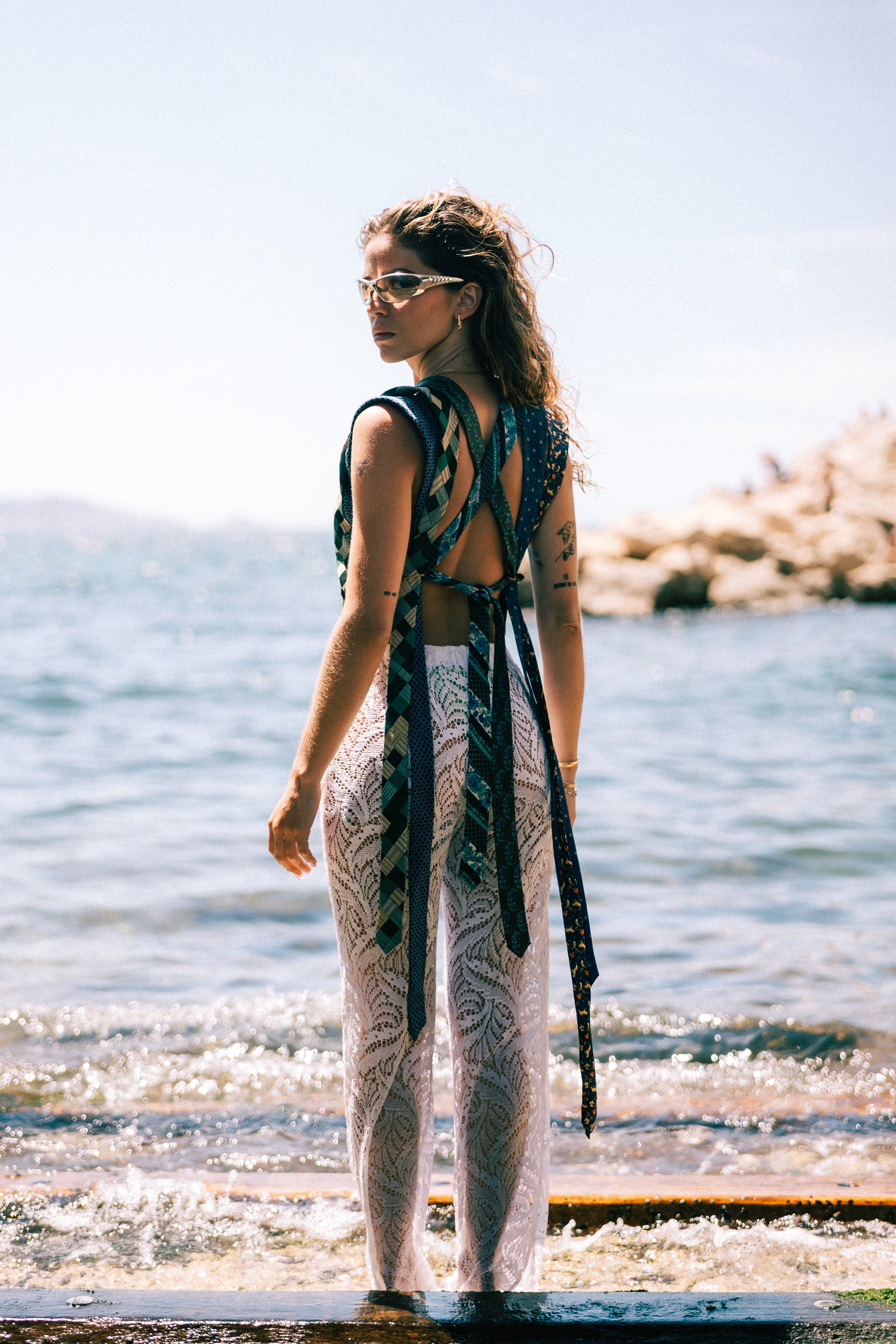 La collection Écume a été shootée à Malmousque par le photographe Florian Puech. C'est une collection d'été, réunissant les pièces iconiques de Salé : gilet cravates, ensembles en dentelle, pièces singulières. Cette collection met à l'honneur Marseille, lieu de création et d'inspiration. Chaque pièces est unique et upcyclée à partir de vêtements et rideaux issus de la seconde main.